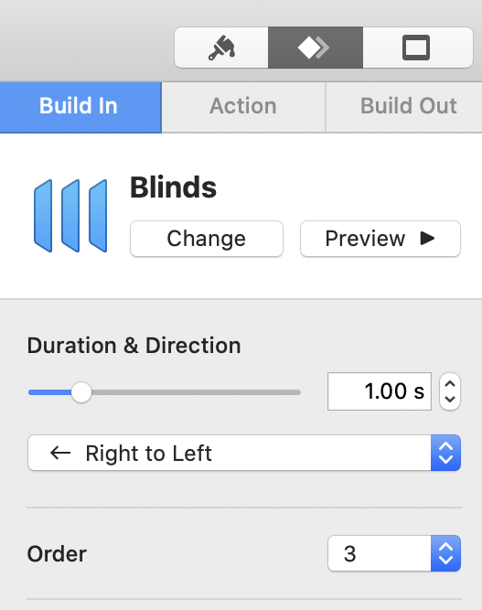 • Apply the required Build In to the selected objects, go to: Inspector /Animate / Build In