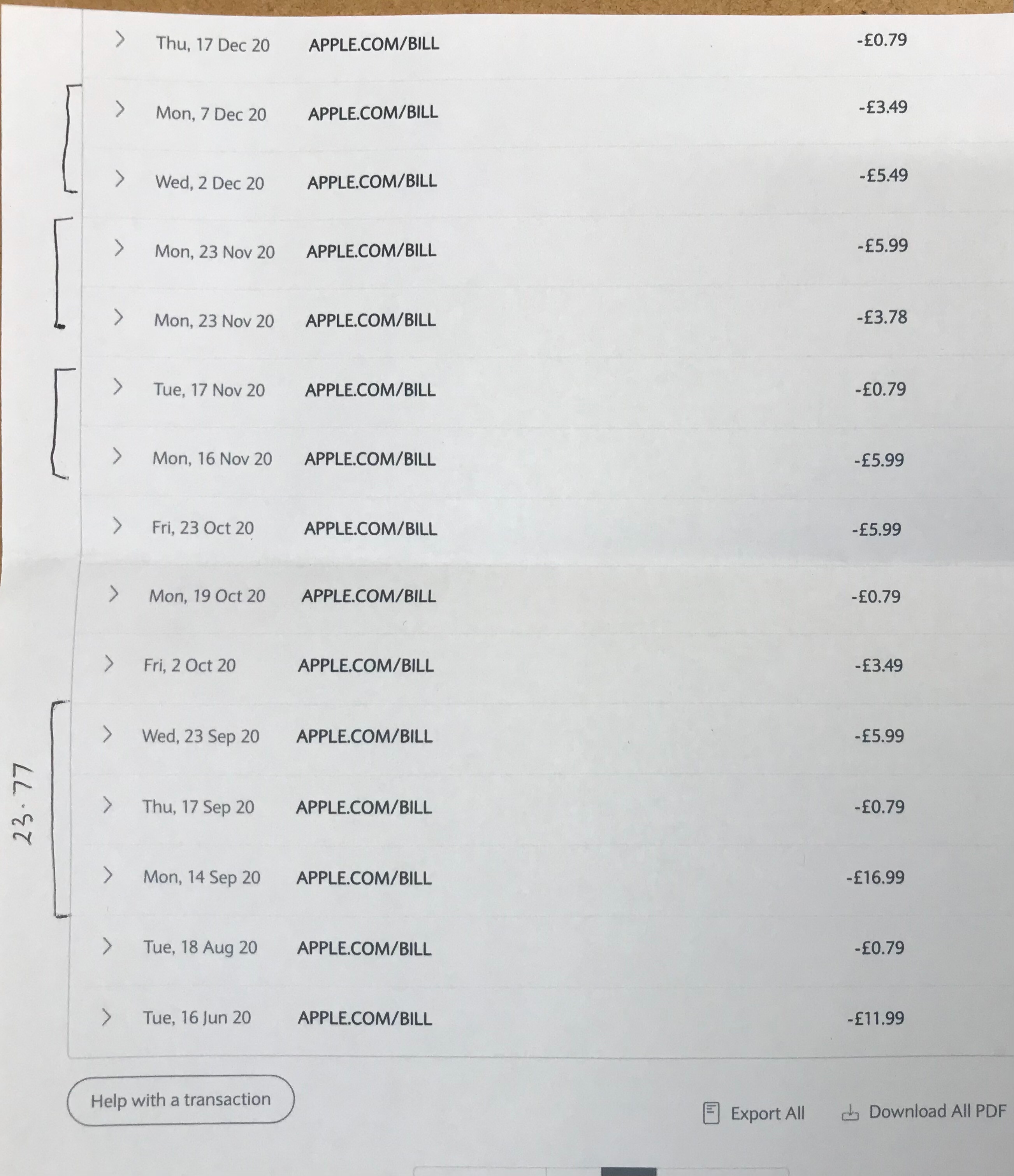 Hi. I have payment/purchases from Apple showing on my bank statement that I cannot trace absolutely anywhere from where they came. Every month on or close to the same date, there are purchases £5.99 and 0.79. There are no purchases or subscriptions showing. On the chat to support for over 2 hours, but they can’t see anything either. Am I missing something? Attached pic is one of four pages.
