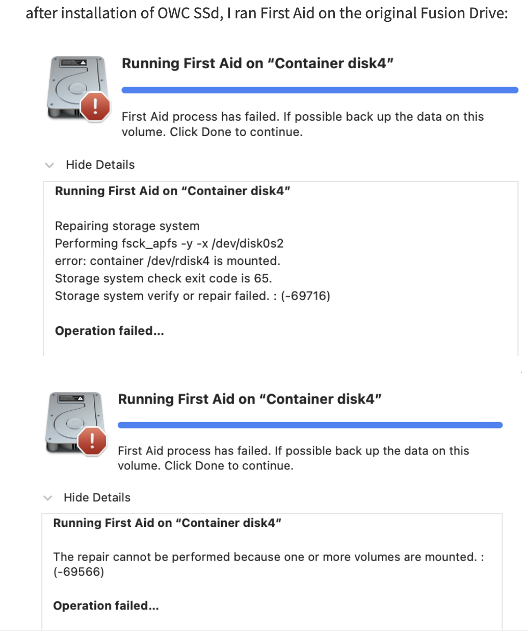 After installing the external drive, OWX Envoy Pro SX, I ran First Aid on the Fusion Drive on my iMac. Context: sluggishness had been present. Per this Forum's suggestions, EtreCheck was run multiple times, as I "cleaned" till it seemed ready to install the SSD as an external drive.) First Aid revealed the Fusion drive "has failed".