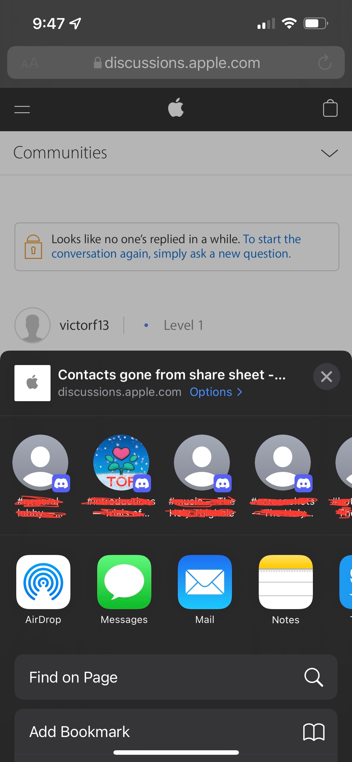 When I share websites or notes, it no longer shows recent contacts in the first line above “Airdrop Messages Mail …” It now only shows Discord channels, but it definitely used to show recent message contacts.