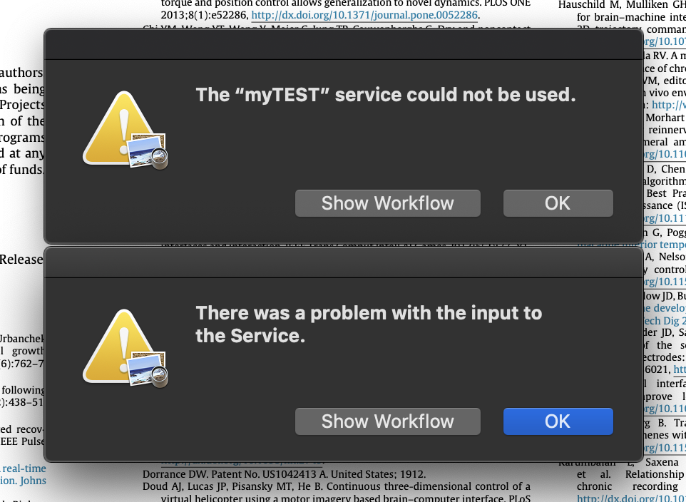 I want to get the selected text in preview app for a pdf file, so I wrote an service like below, want to get the selected text, and process in an AppleScript, but always got two error dialogs, no further information, (but it works well in Safari) Could someone give the help to fix it?