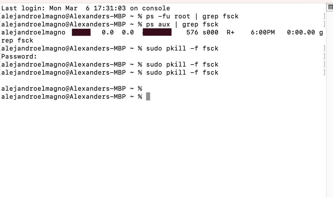 The first two commands shown beginning with "ps" is showing the running processes and filtering for the "fsck" process....the "fsck" process was not active at the time since the only result returned is the processes searching for the "fsck" process. The other "pkill" commands are worthless since "fsck" was not running at the time.