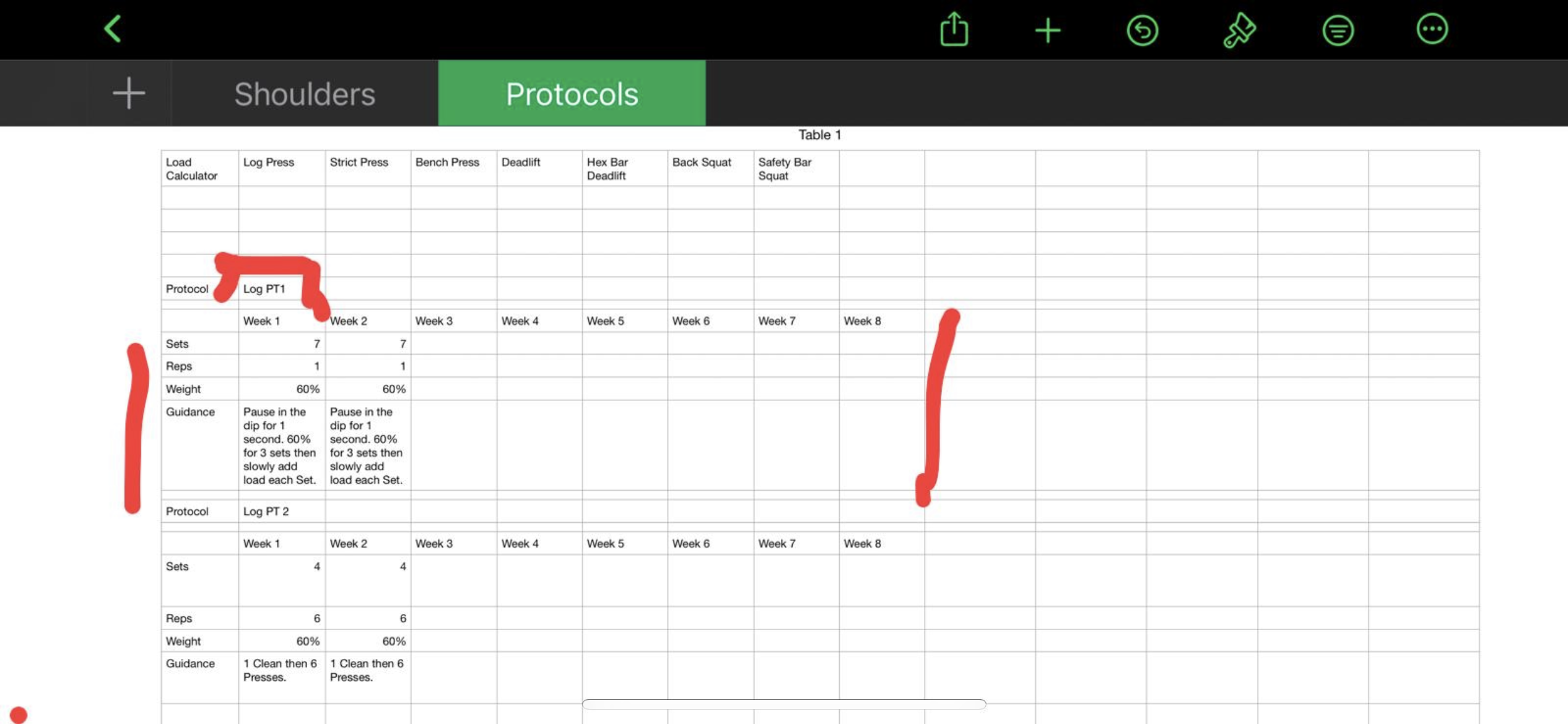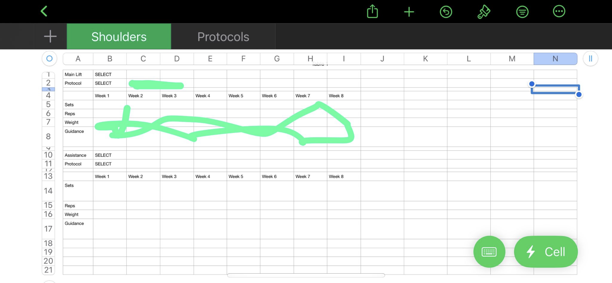In sheet 1 called "Shoulders" I want to be able to select from variety of protocols and have that auto populate the table highlighted in green.