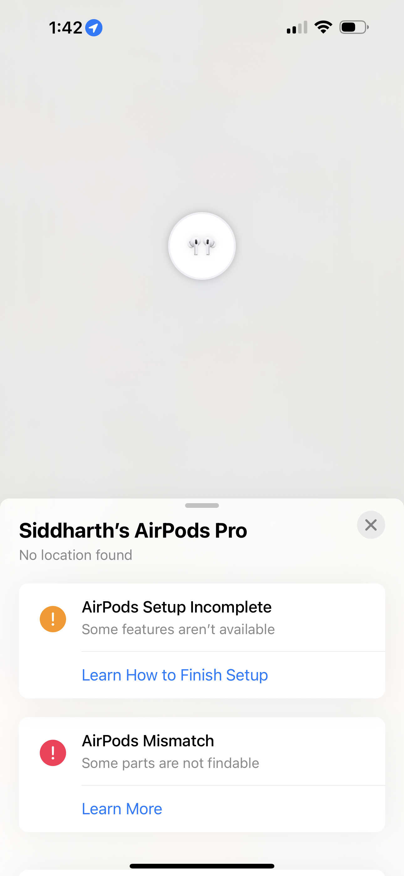 "Airpods mismatch and airpods setup incomplete: Today i purchased airpods pro 2nd generation and observe the above screen on find my. Is there any solution to resolve this issue? I reset it once when i observe an issue Thanks in advance"