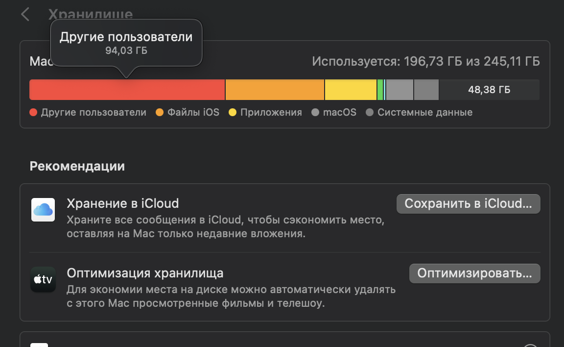 Hello, I went into the storage in the settings and noticed that 94 GB is occupied by the line (other users) except me, no one uses the computer, how can I delete it?