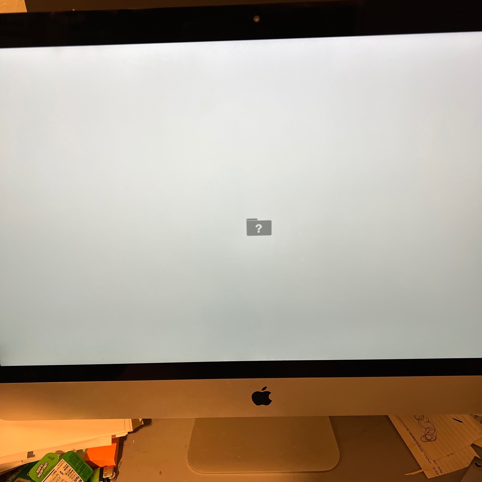 The question mark indicates the Mac cannot find a valid OS startup disk drive.