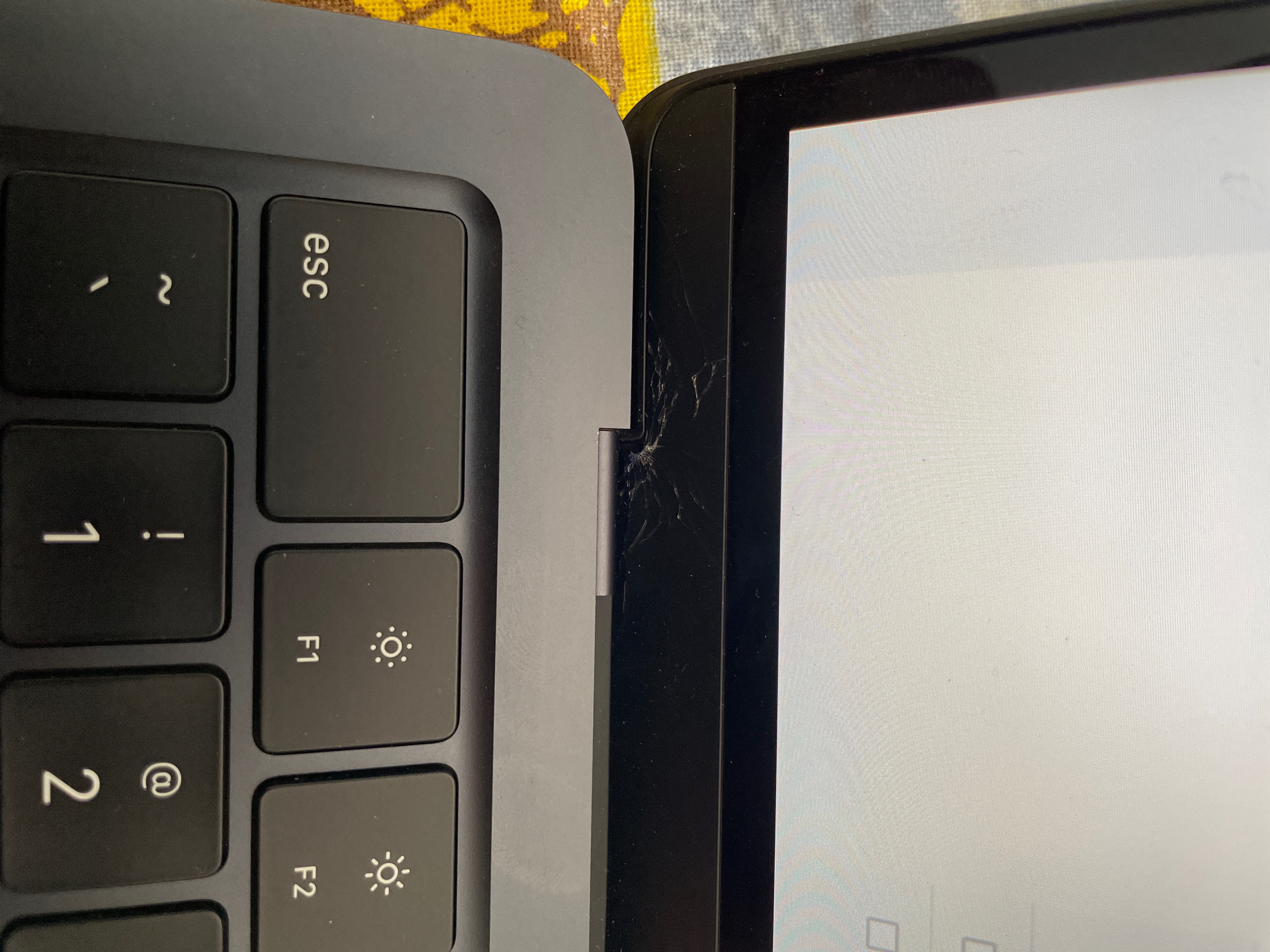"Crack on bezel on MacBook Air M2: Here is a picture of the same if that can help. I saw some news on the internet this being the manufacturing fault."