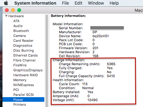 4) And use System Profiler (in your Utilities folder) to see the status of your battery. Choose "Power" from the left-hand content pane: