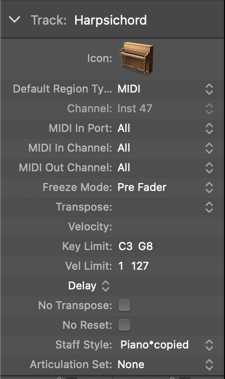 To do this, I duplicate the software instrument I intend to use, and I put both in a track stack. Within the track inspector for each instrument, I restrict the range to be mutually exclusive. Here, I have set the range to be C3 and up, whereas the other harpsichord instrument in my track stack is B2 and below.