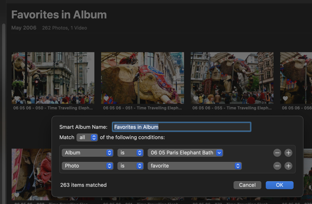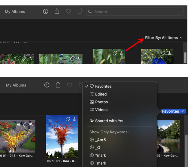 You can choose to see only videos, only the pictures with certain keywords, only those that have been edited, and only Favorites. If you click on Favorites, then the screen will show thumbnails of all the favorites in your album. Double clicking will bring a selected picture to fill the space. Fn-f will show the picture full screen.