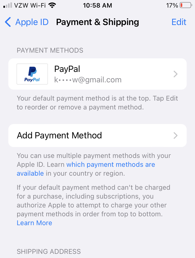 The first photo confirms that Paypal is the only payment method. The second photo shows the persistent removed card that appears when I try to use Apple Pay.