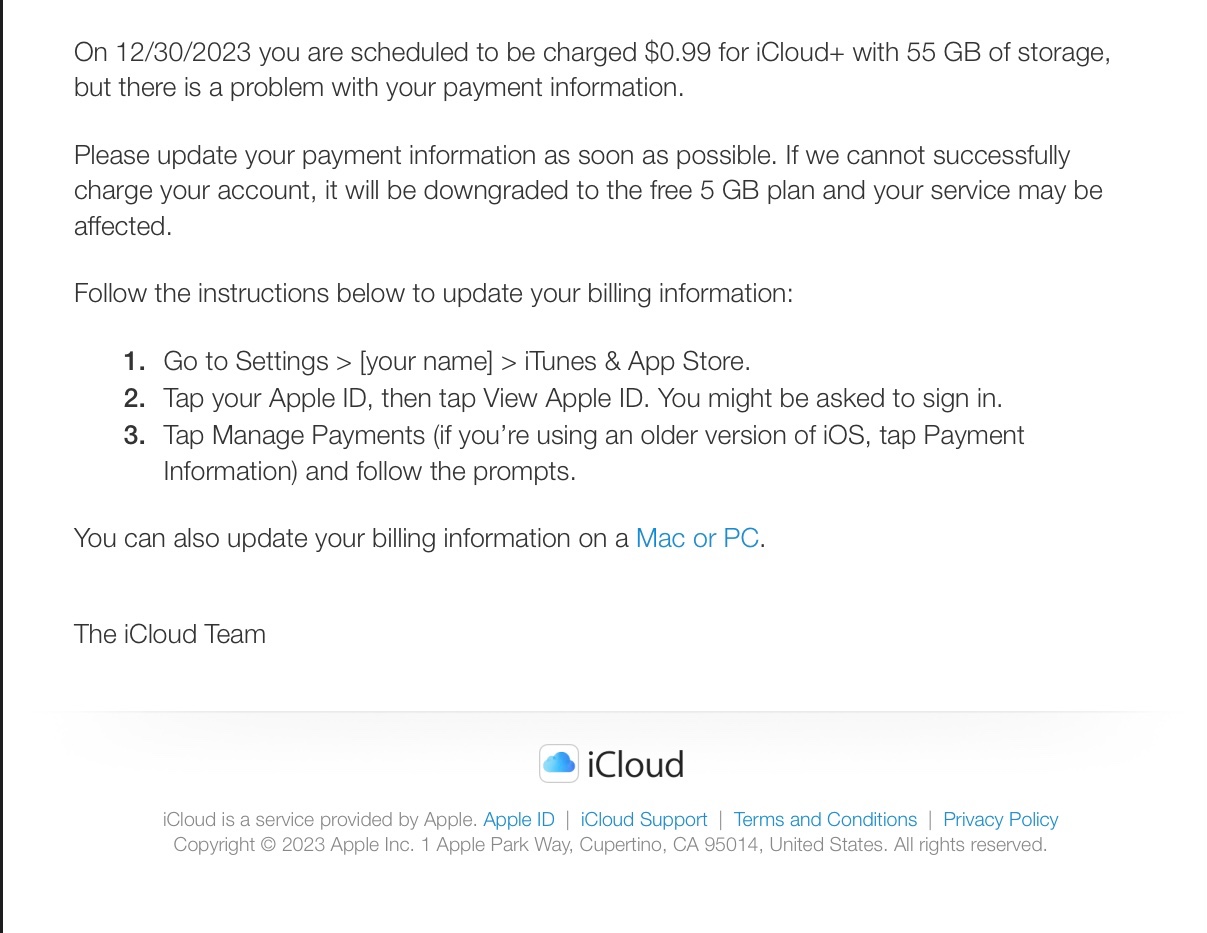 • Apple emails have Apple branding, not iCloud branding.