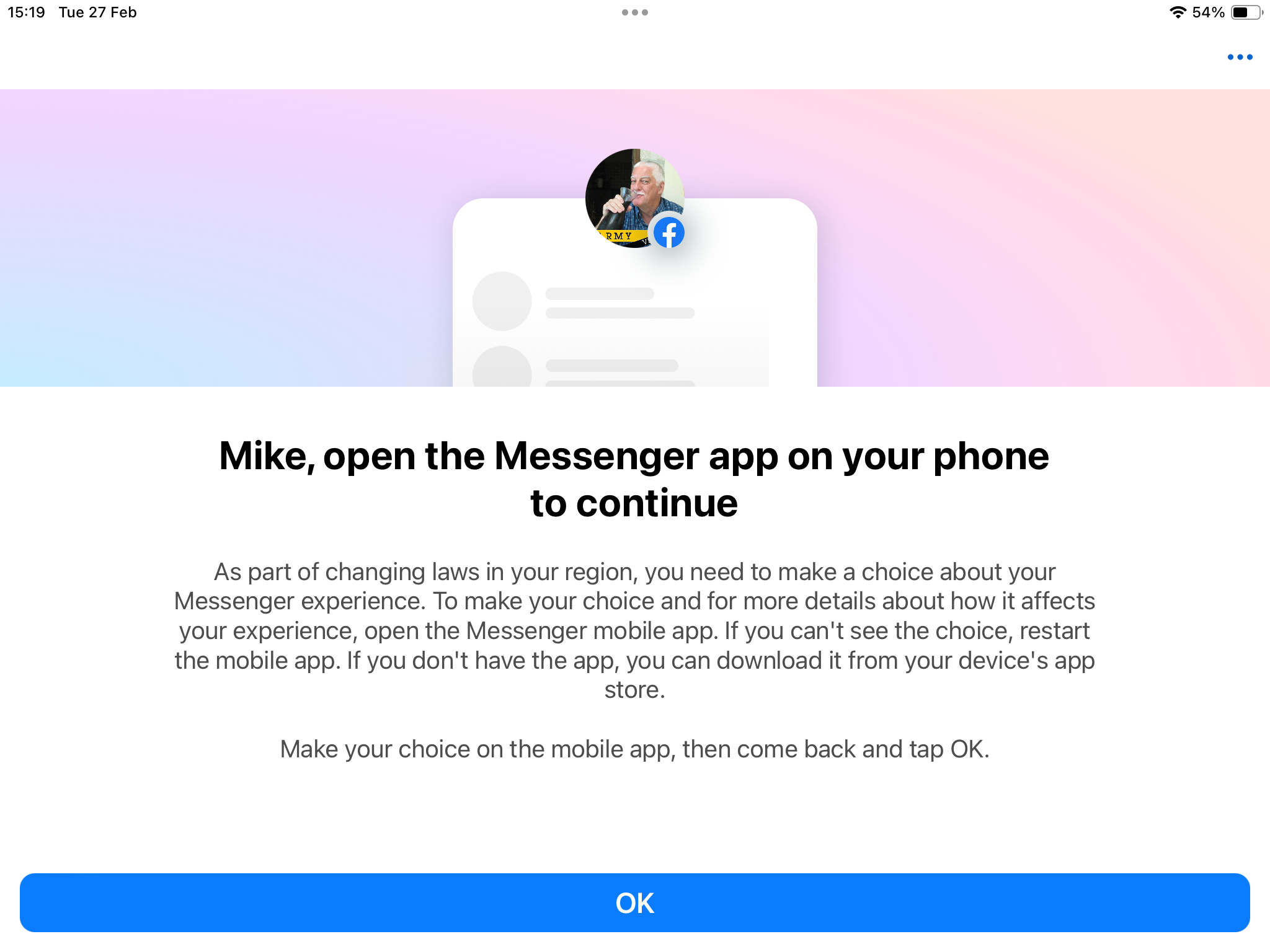 I installed it on my phone, logged in, was offered a choice about keeping my account or creating a new one. Made my choice (keep). Went back to iPad… still stuck on the same page. Restarted Messenger, but still the same.