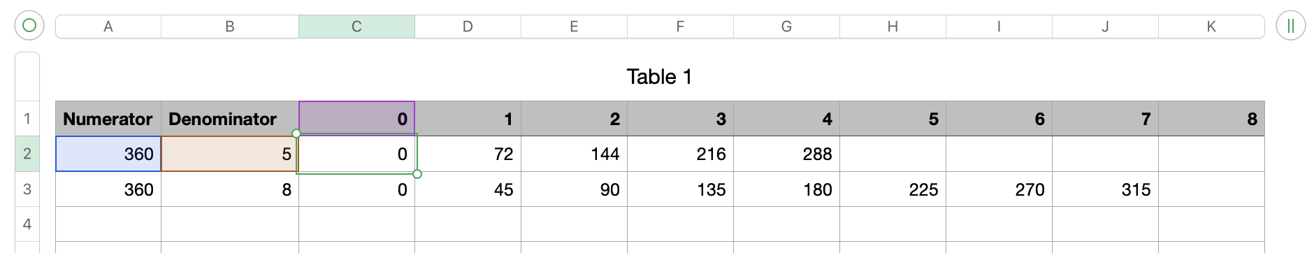 I want to divide for example 360/5 and get the five answers in separate cells? like 0, 72, 144, 216, 288