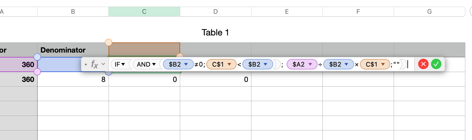 Formula in C2 =IF(AND($B2≠0,C$1<$B2), $A2÷$B2×C$1,"")