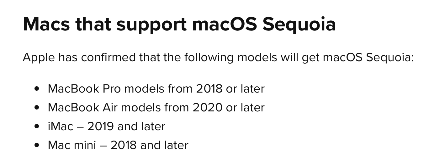 Out of curiosity, I decided to stop by an Apple retail store and an apparently competent young man suggested I upgrade to Sequoia. I responded that Apple states Sequoia is not compatible with the MacBook Air prior to 2020 to which he disagreed. Hmmm. Am I starting to sense some classic big company 'silo-ism' here?