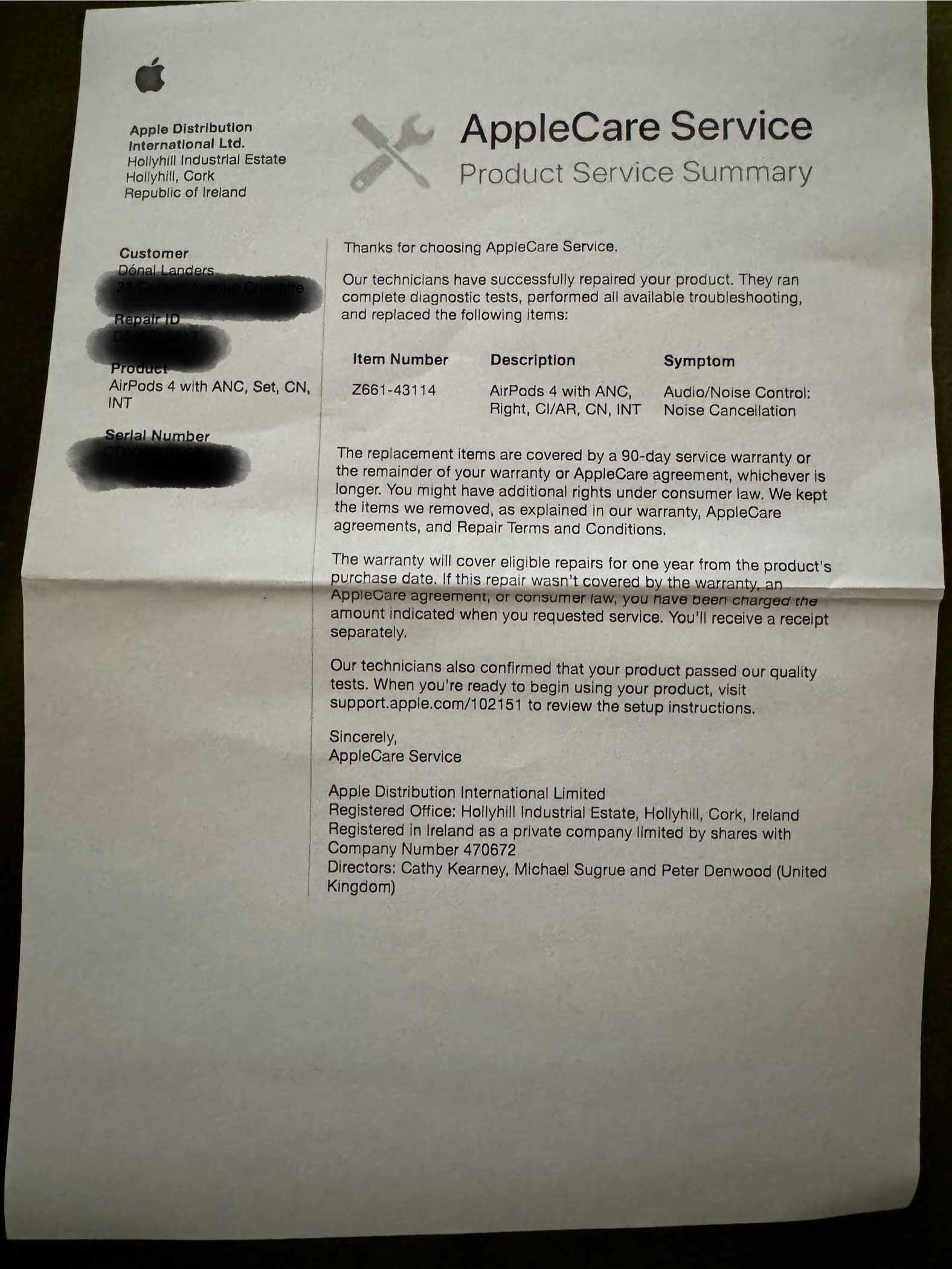 AirPods 4 now returned to Apple to identify root cause of problem. Should hear back in several days from them with diagnosis.