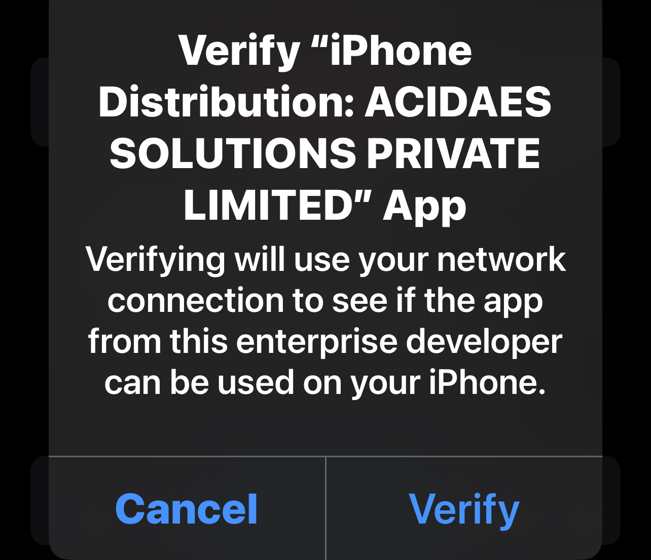 "An app from developer... is not verified on this iPhone and will not run until it is verified using your network connection"