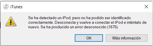 The PC recognices the iPod only for a few seconds and then iTunes gives me the "2005" error or sometimes it shows the recovery menu but the "1675" error shows up saying the iPod couldn't be detected.