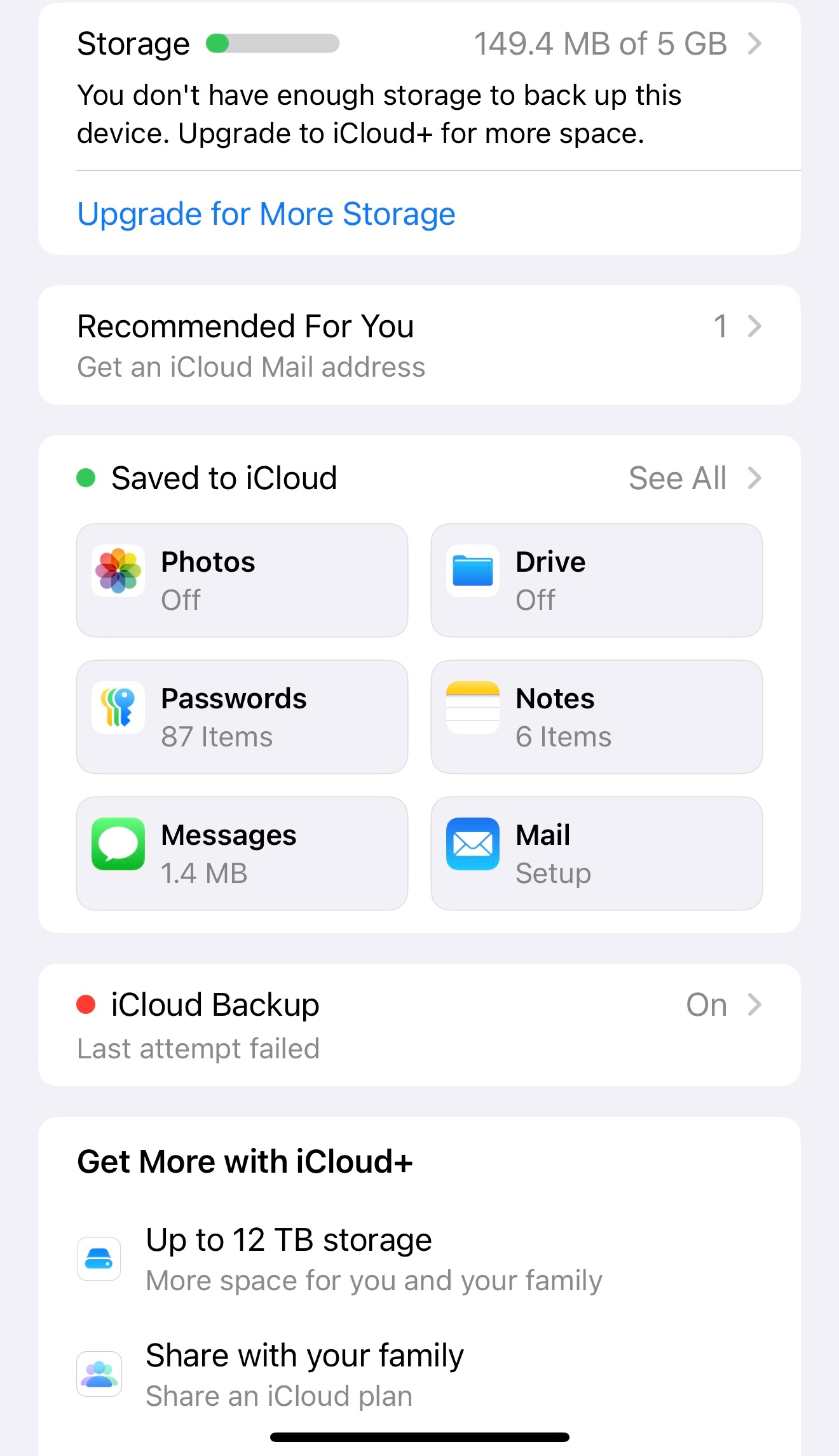 In this screenshot, it depicts that "Last attempt failed" in iCloud Backup pane. Go Here: If you can't Back Up to iCloud - Apple Support
