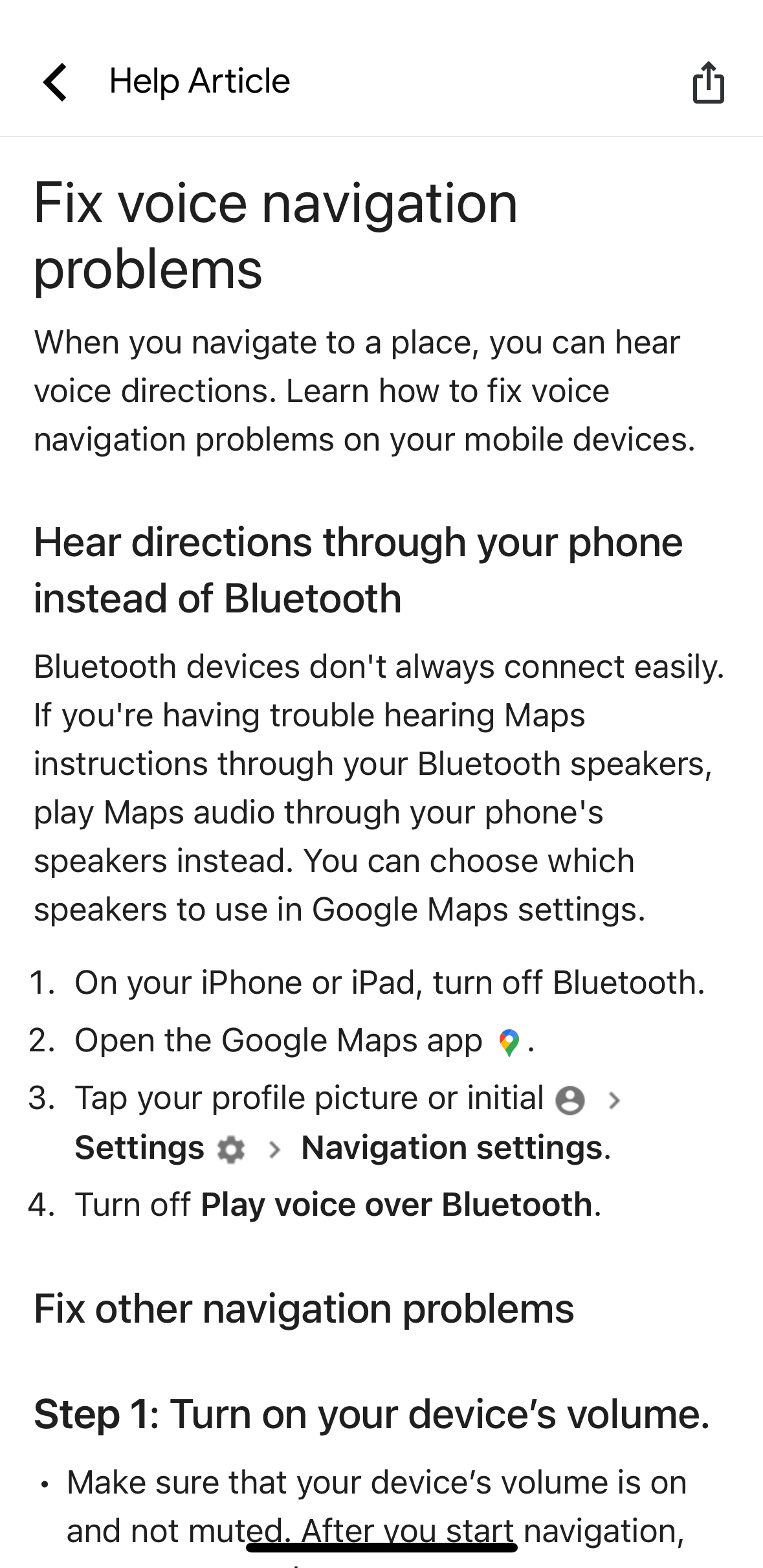 When I am using Google Maps, the audio cuts out. I get the first instruction, and the other instructions have no audio. I have all the apps off, and I have the volume at maximum. Any clues?