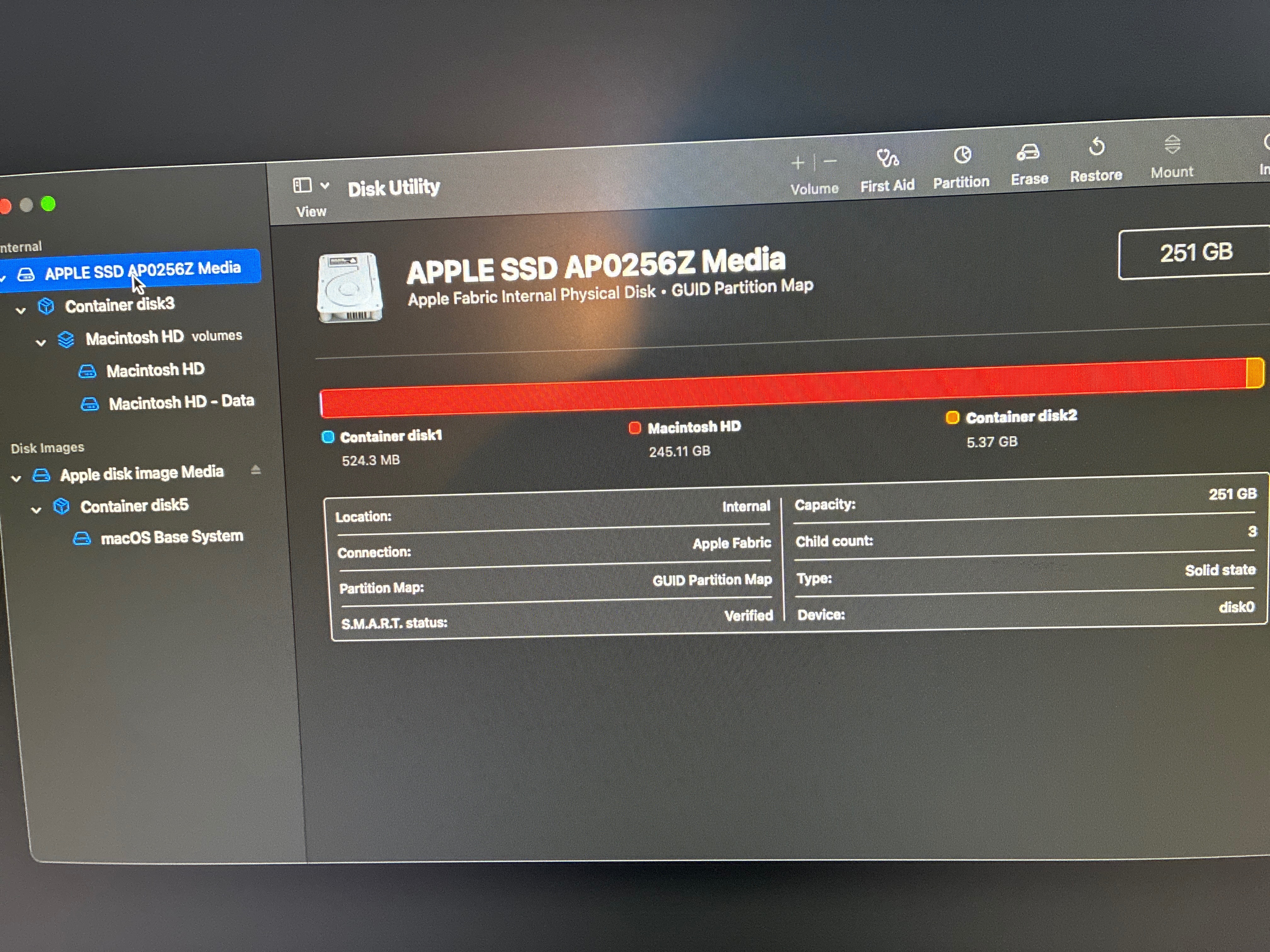 NOTE: Disk Utility may also display a disk image named “Apple disk image Media” along with the volume “Mac OS Base System”. This disk image can be safely ignored. User interaction with this is never required and in fact, in the latest versions of macOS 15 that disk image is no longer displayed in Disk Utility.