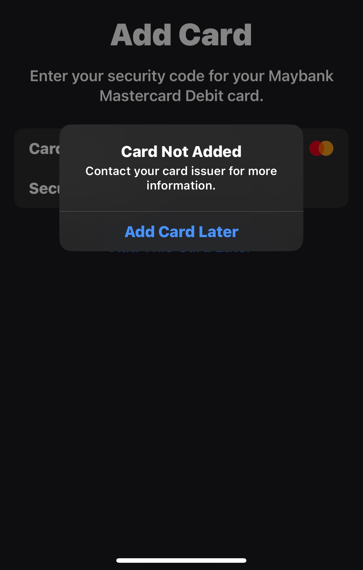 I have an issue with my iPhone 16 Pro, I’ve tried to add my debit card into my wallet it says card not added. And btw my MacBook, iPhone 14 Pro device and Apple Watch is able to add the debit card into wallet and verify. But why my new device iPhone 16 pro is keep showing me card not added? I’ve contact to bank issuer, there’s nothing wrong on their side they tried to register new token to my current device too. But totally is not working! Is this iPhone 16 pro bug issue?