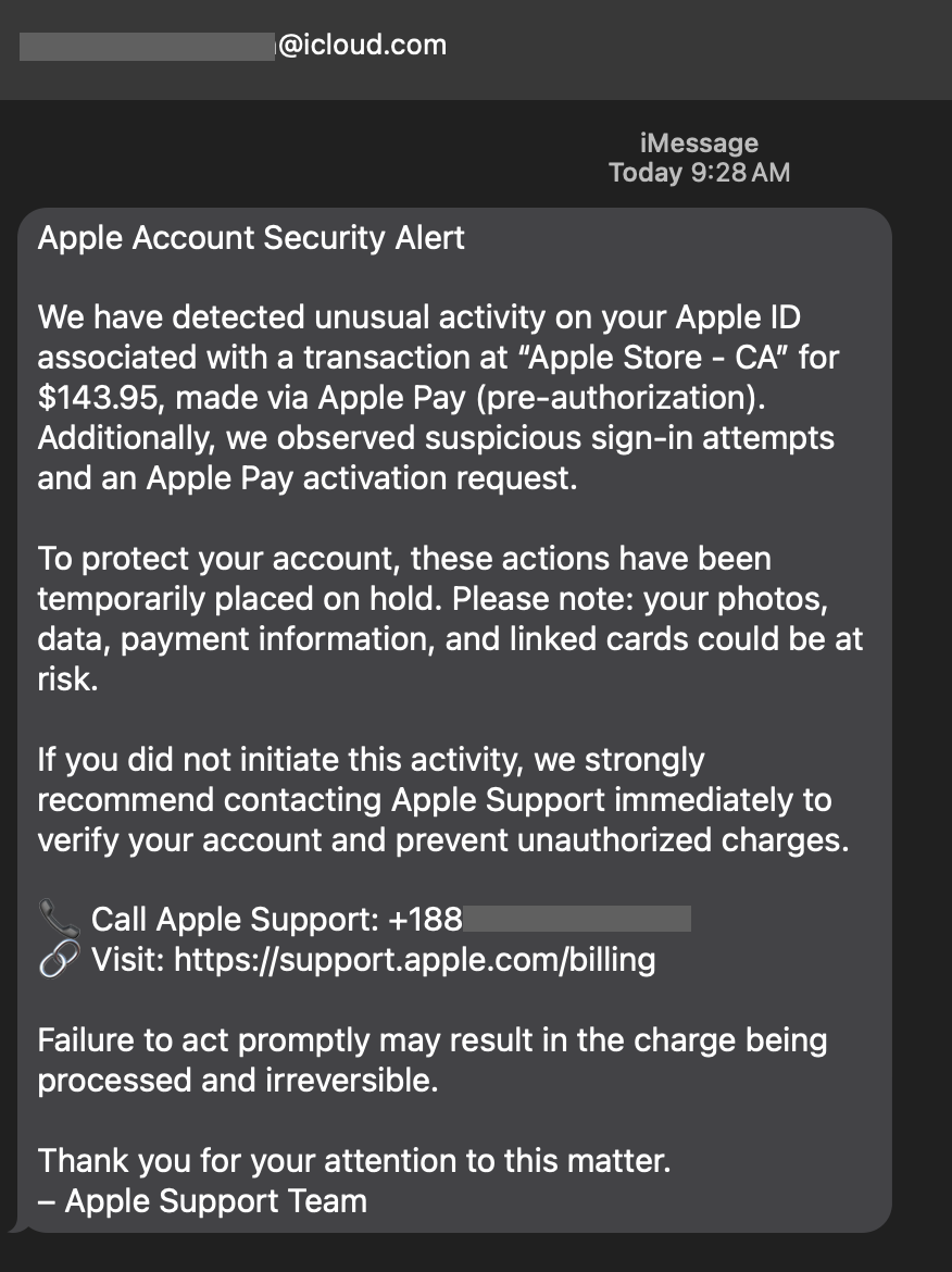 We have noticed that your Apple iCloud id was recently used at "APPLE STORE - CA" for $143.95, paid by Apple Pay Pre Authorization. Also some suspicious sign in request and apple pay activation request detected. That looks like suspicious to us. In order to maintain the security and privacy of your account we have placed those request on hold. Your Photos, Data, Bank Information and Cards are at risk. If NOT you? talk to an Apple Representative. Failing may lead to auto debit and charge will not be reversed. Call +1*********  immediately to cancel this charge.