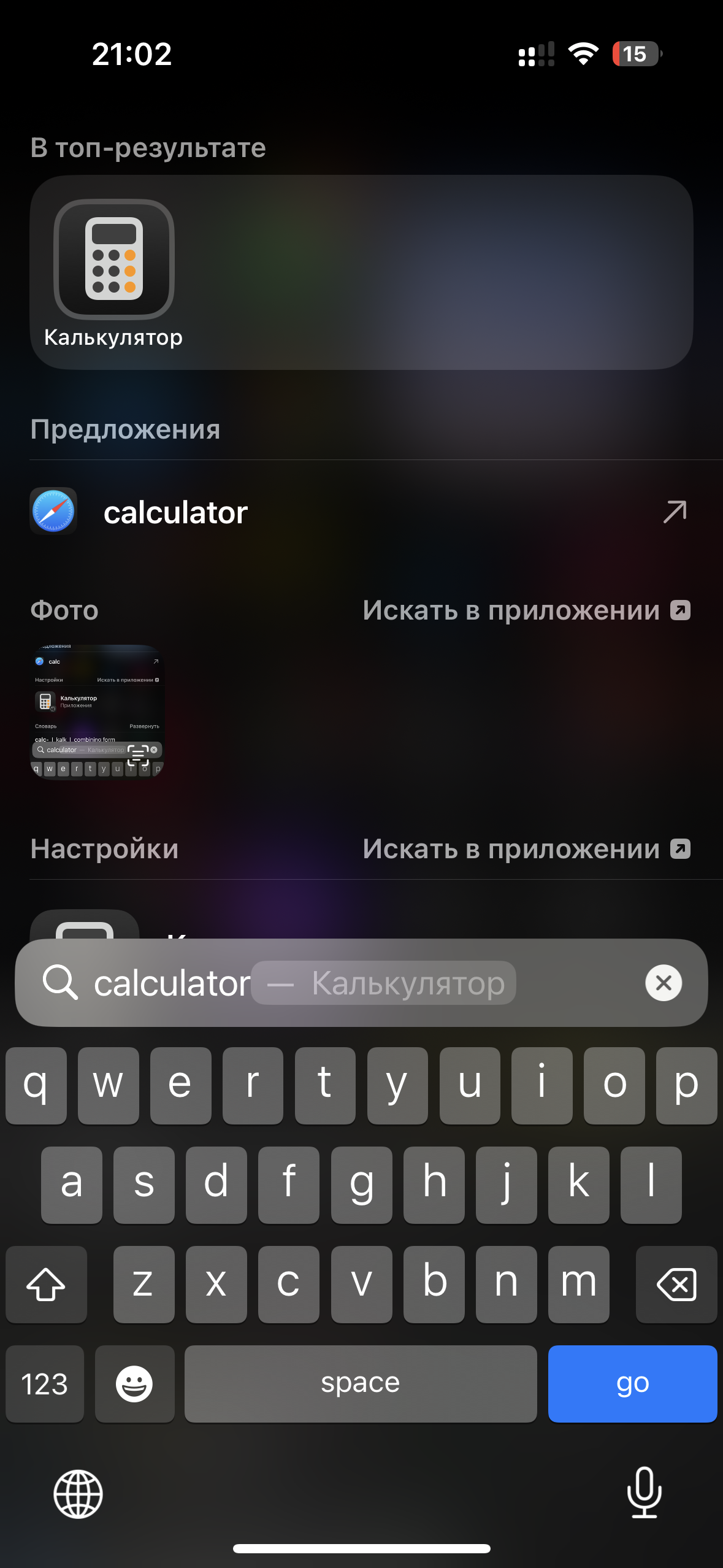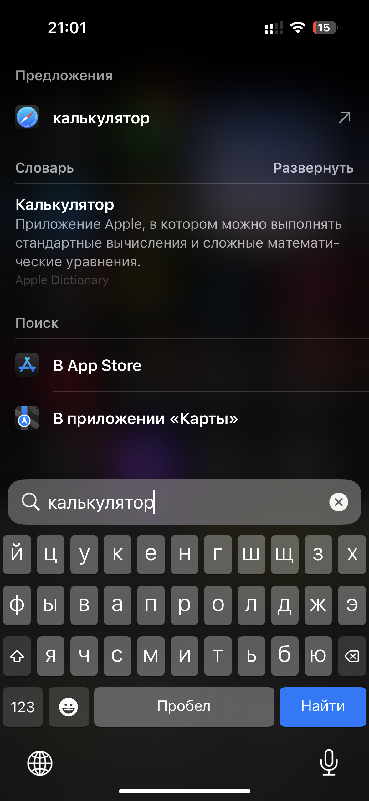 – Typing “Калькулятор” shows Safari and dictionary results, but not the app itself;