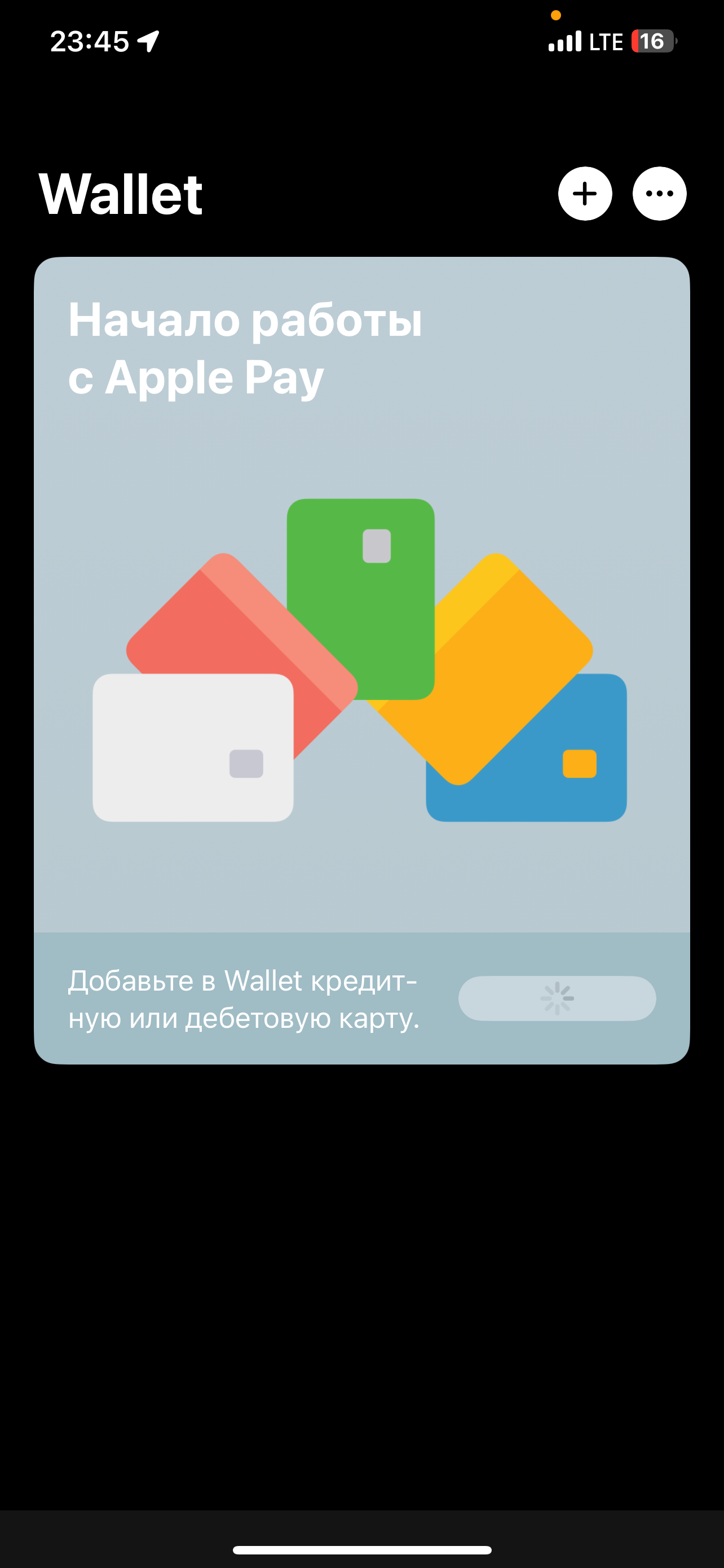 Wallet при нажании на доболвение карты , он начинает крутится и больше ничего не происходи. и как я не пробовал добавить карту , далше бесконечной иконки загрузки я не вижу. помогите решить проблемму