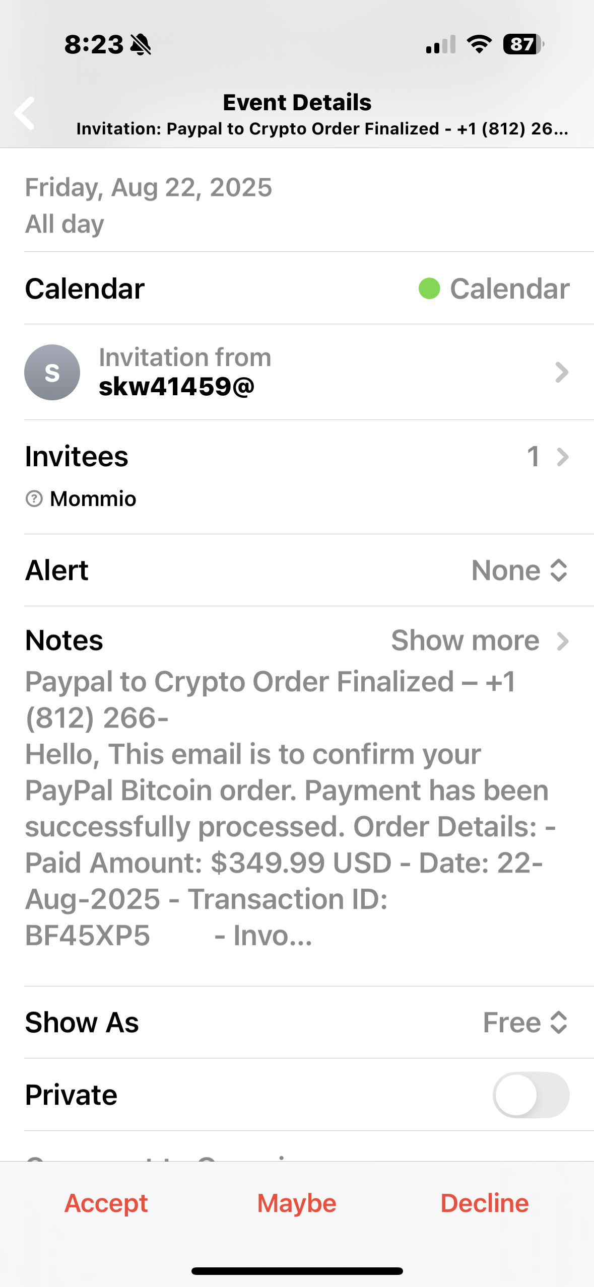 Today I received an invitation from a scam to transfer money from PayPal to crypto. I declined the invitation, but it keeps reappearing. I was not able to block them immediately, so I had to add them as a contact and then block them. But it still keeps appearing on my calendar.