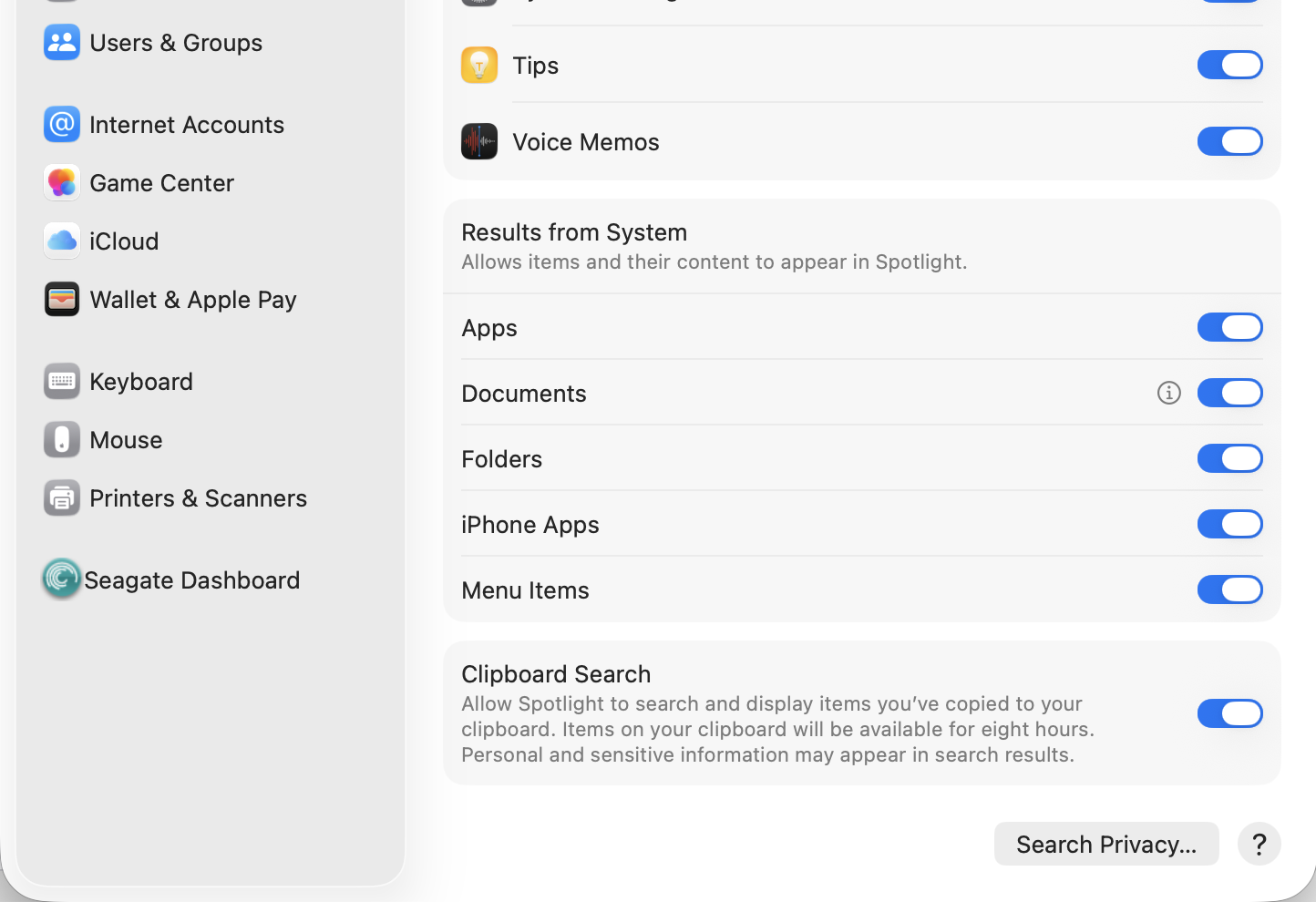 I have OS 26.0.1 on my Mac mini. Spotlight returns results from the Internet but no longer finds file names. How do I make it find files on my hard drives and iCloud?