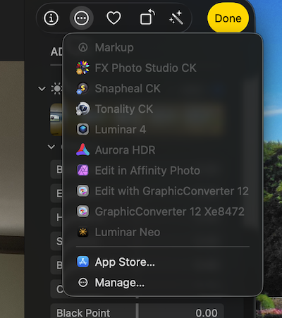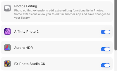 I just upgraded to Tahoe and Apple Photos will not let me select a third party editor for photos. I can see them in the info icon and they may be greyed out, but can't select them. I checked settings and they are "allowed". Can't figure out how to fix this bug