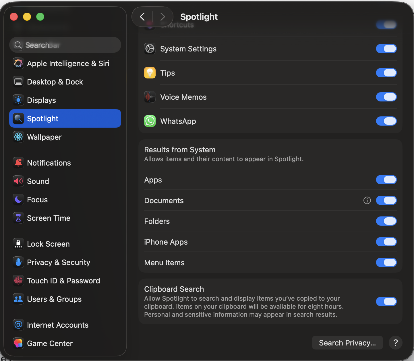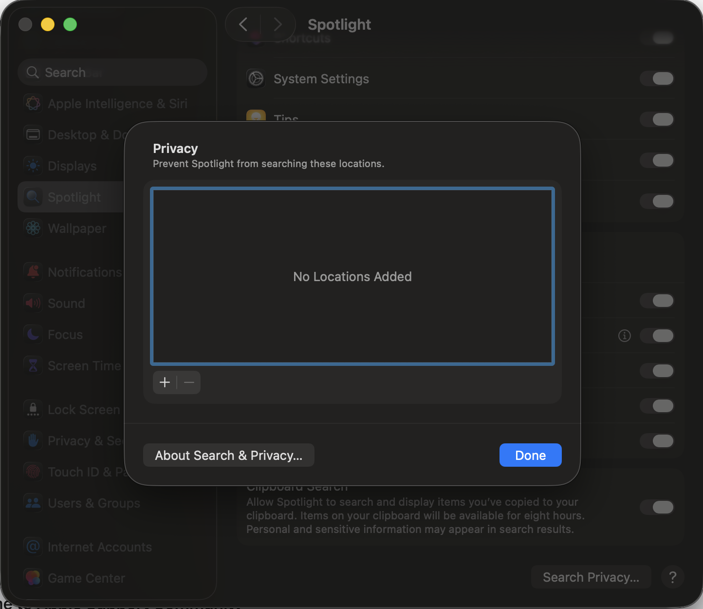 System Settings → Siri & Spotlight → Spotlight Privacy