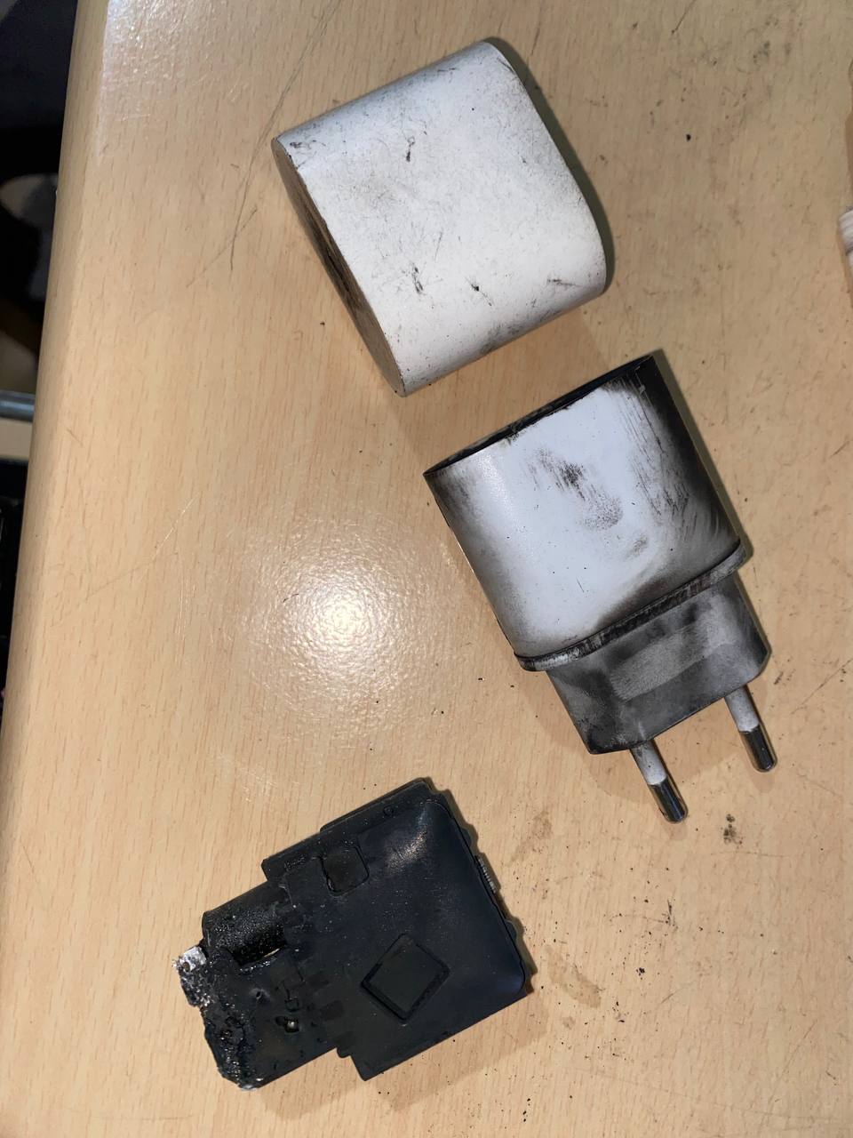 Купил адаптер 2 года назад, заряжал без проблем оригинальным проводом iphone11-ый, провода прожил чуть поменьше, затем взял другой оригинальный. Неделю назад начал слышать трескающиеся звуки из адаптера, и сегодня во время зарядки он взорвался, корпус разлетелся, затем адаптер торчащая часть адаптера из розетки загорелась, после взрыва везде был чёрный порошок видимо в процессе горения.