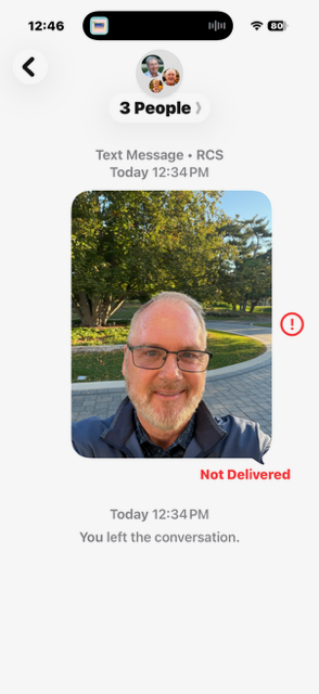 I got a new iPhone 17 a few weeks ago. I have two parents on iPhones and a sister on an Andriod. When I send a text or a picture to them, it has been failing to go through. Not only that, but my phone is making me leave the conversation. When it comes back as Not Delivered, it boots me out. I have lost all of my messages with my family thread because of this forced leave. If I rebuild the group text and try again, it forces me out again. No one else on the other end is booting me out of the conversation. What is the issue here? Is there a setting to fix or is this a bigger known issue? Two screen shots are below.