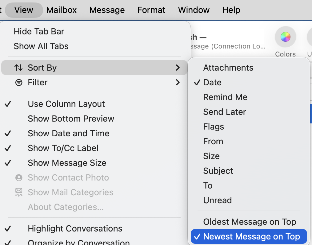 I have a mailbox that always opens with the scrollbar at the top (Oldest e-mail at top) I want the newest email at the bottom. Only one of my inboxes opens with oldest at top. The others all have the newset email at the bottom (Same order but scroll bar at bottom - presenting the newest emails.)