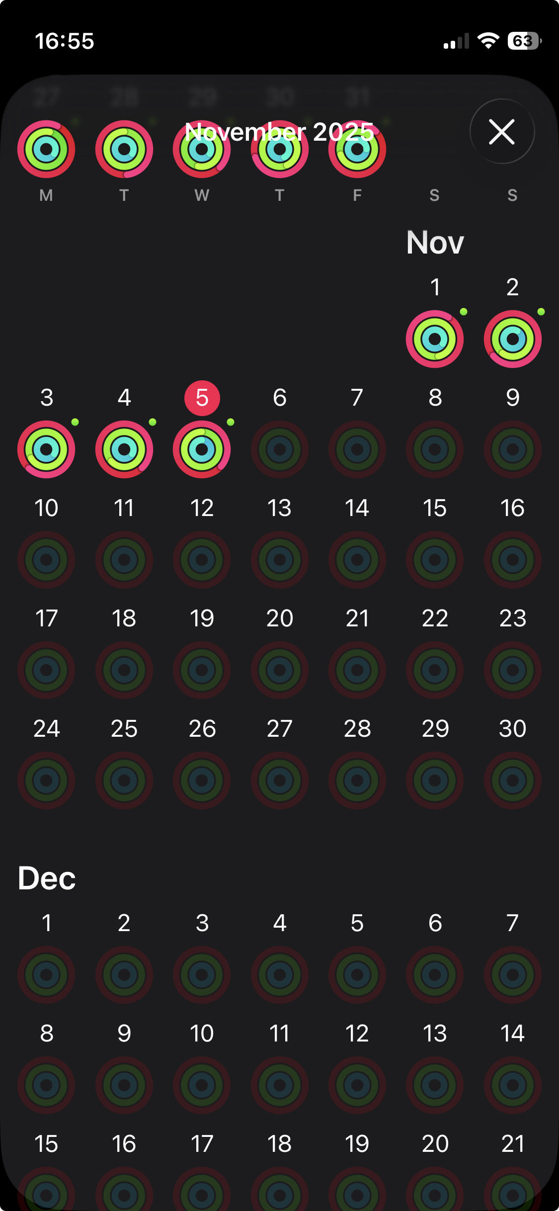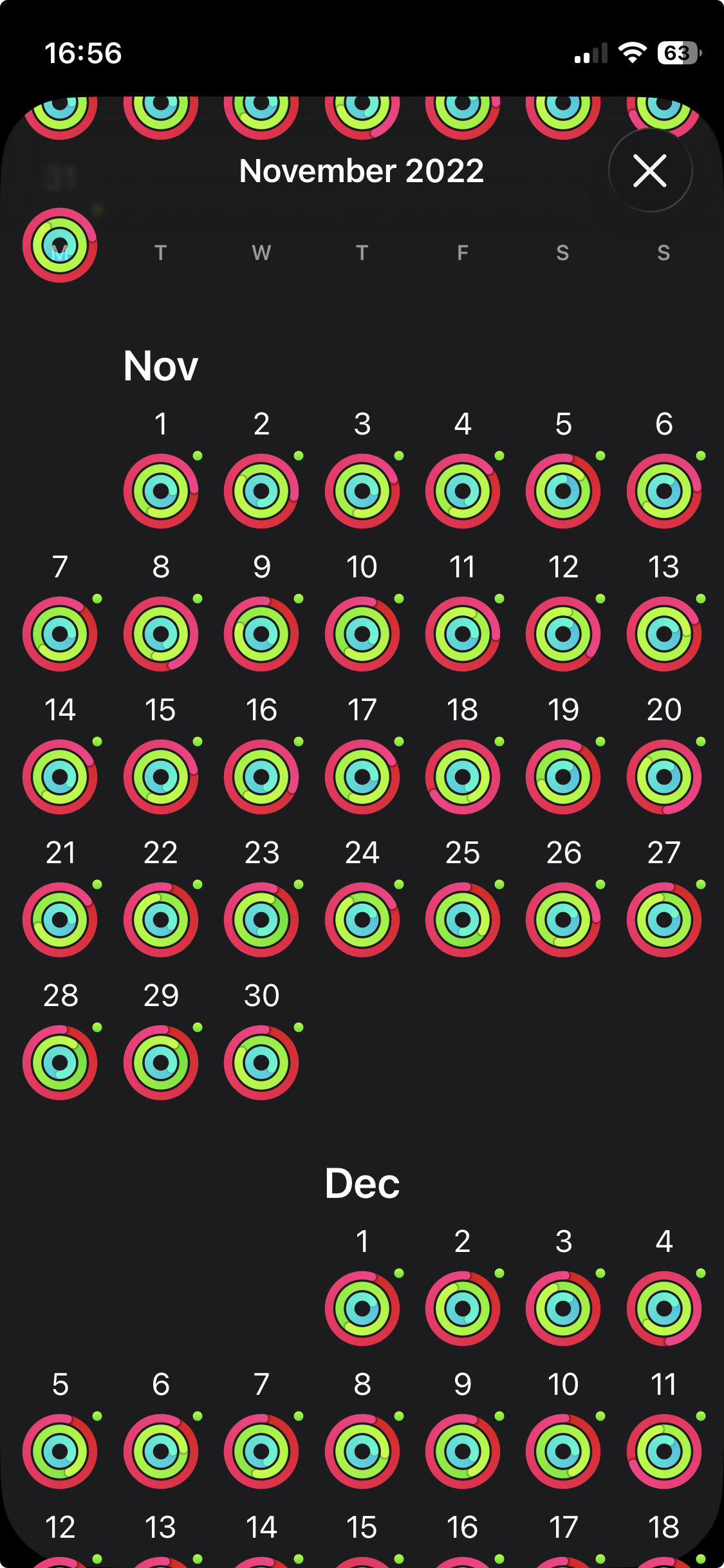 This will open your Activities for Today. Tap on the little calendar icon in the right above corner to view the whole month. Then you can scroll back month by month. To see the workout stats for a certain day, tap on the date.