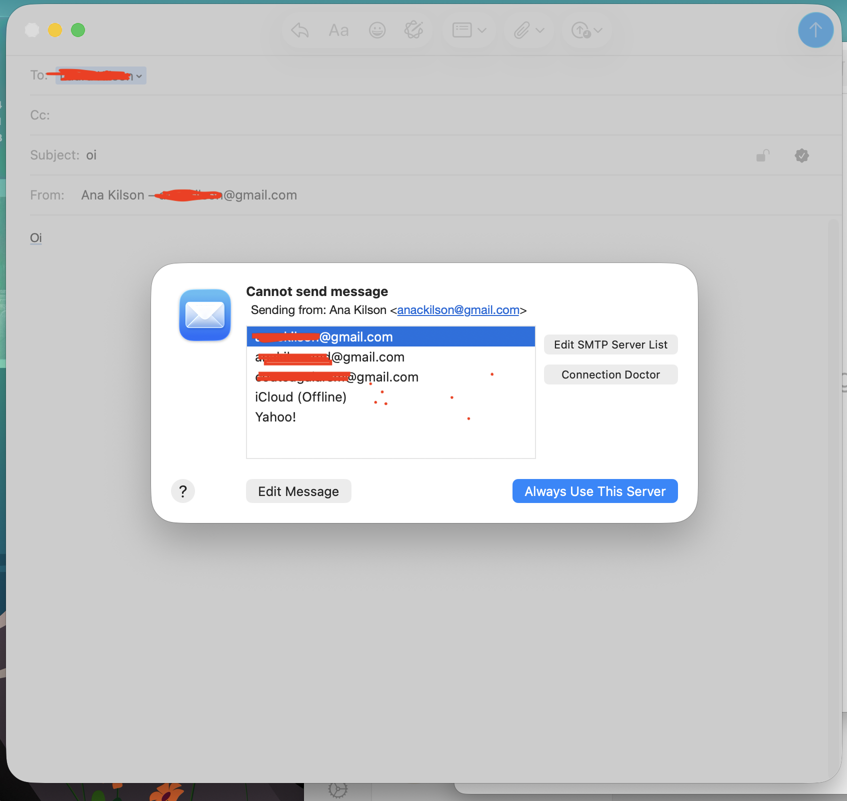I’m having an issue with the Mail app on my Mac. I have multiple Gmail accounts added, and I can receive emails normally, but I cannot send messages from one of them. When I try to send an email, I get a popup saying “Cannot send message”, and it asks me to select a different outgoing mail server.