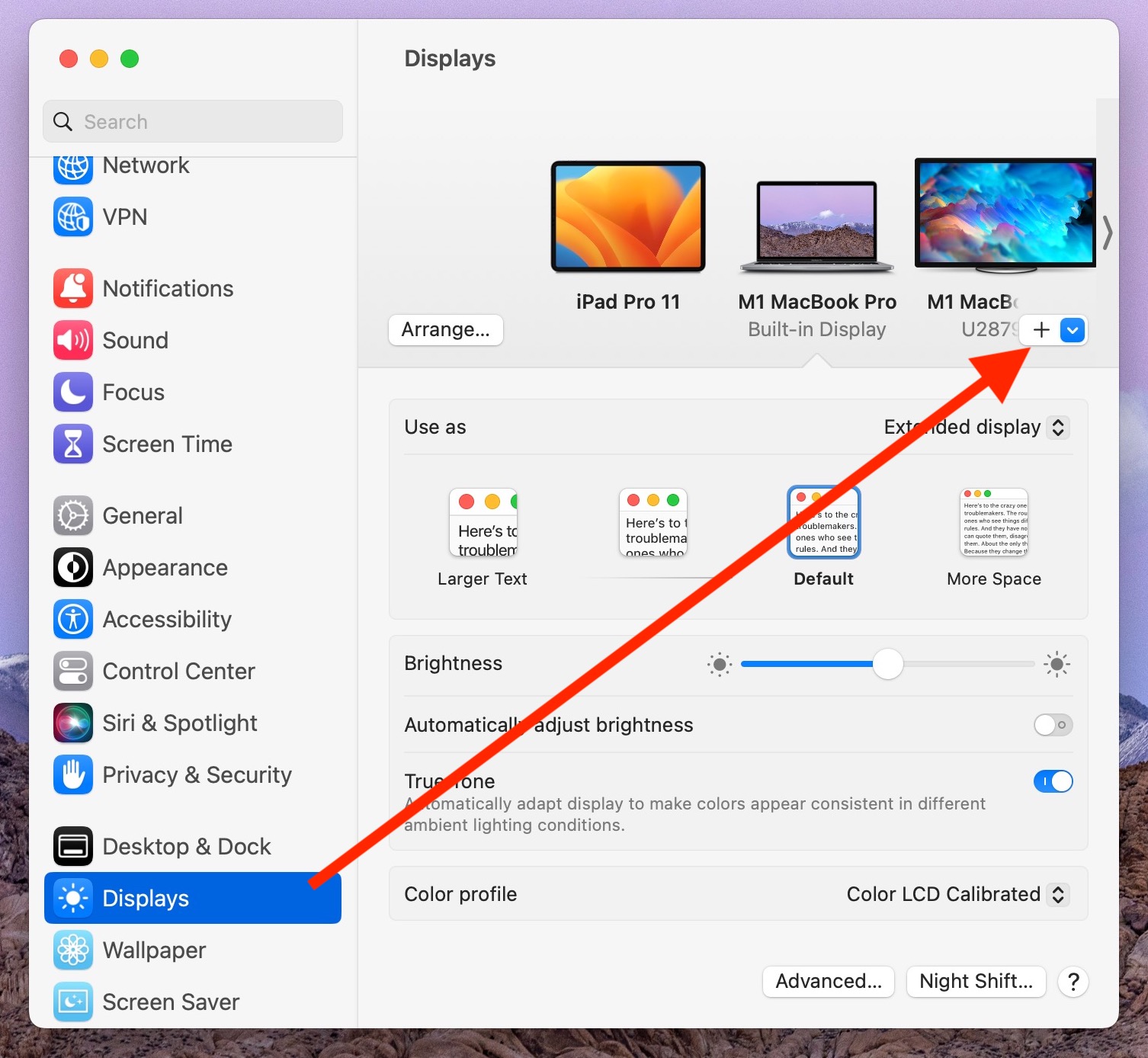 In Displays in System Settings, do you see a small [+ v] button dropdown?