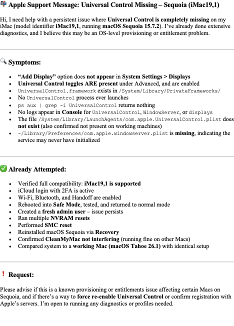 Cannot get Universal Control to work on iMac i9. It's been upgraded to Sequoia 15.7.2. Below are my troubleshooting details. Any help?