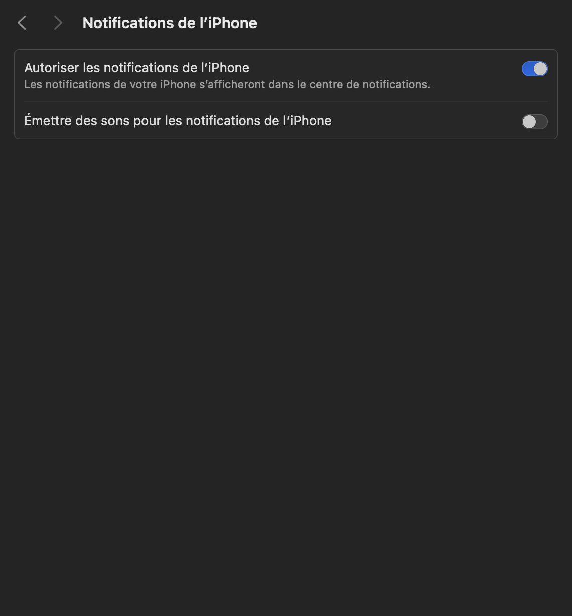 Since yesterday, the notifications I receive on my IPhone don't show anymore on my Macbook, and this despite having "Allow notifications from IPhone" on my Mac, though it doesn't show me which app I can allow notifications, which could be shown previously).
