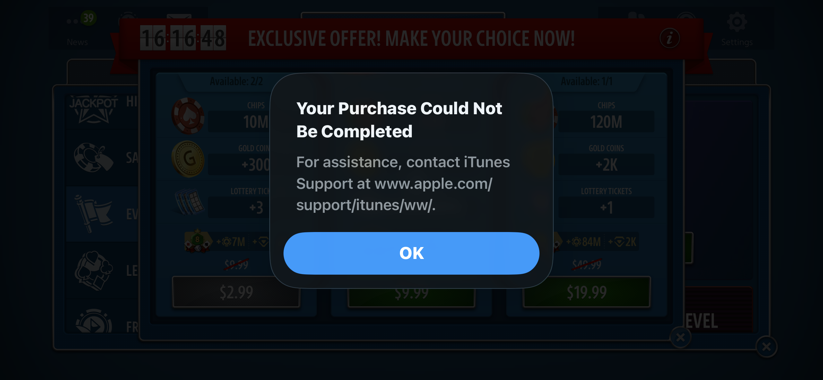 Hello, my purchase with a gift card was only in the pokerist game and no changes occurred. My gift card code is added to my account. I only encounter this message at the last part of the purchase. Unfortunately, I cannot use any Apple support. Apple support does not include my country.