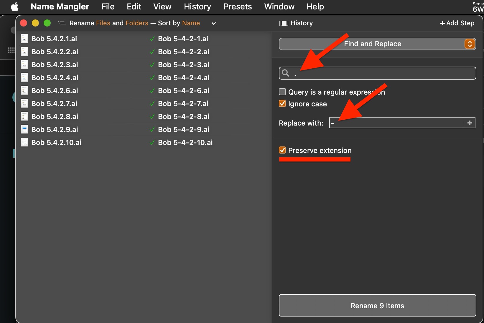 To reduce compatibility complications, I want to batch rename the files, replacing periods with hyphens but finder keeps changing the period before the extension to a hyphen even if extensions are hidden.