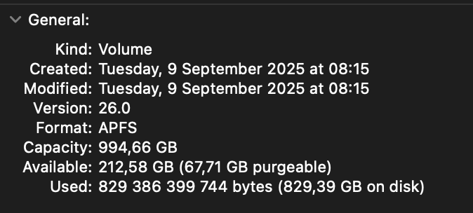 Space may appear as "Available", but the FREE space is only equal to "Available" MINUS "Purgeable".