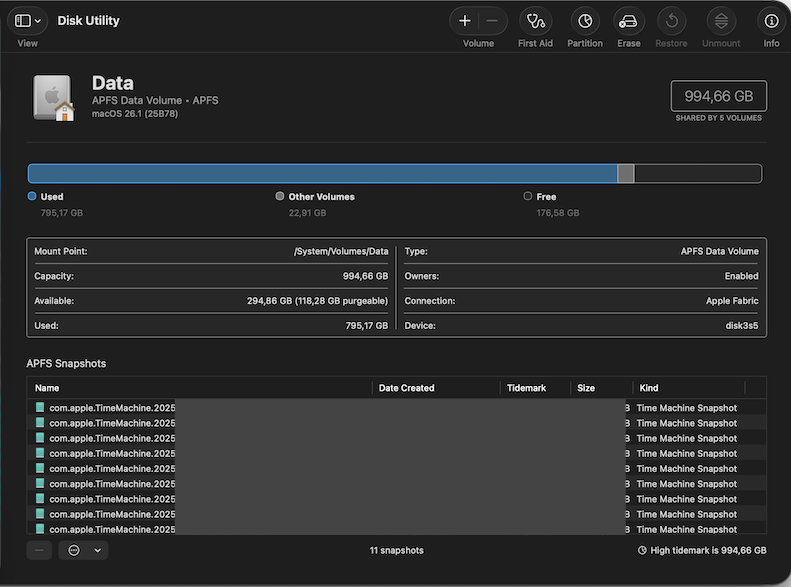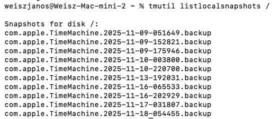 Bigger picture, personally I have no issues with TM backups to a Synology DS223j. Five Macs in the house back up to it, and I also have a set of 4 TB SSDs that I use as secondary backups and connect once a week to run a backup then swap the SSDs to an office location (that's why my list of snapshots in the screenshot above has one from 11/11 and 11/18, those are the last successful backups to the SSDs and the others starring with 'yesterday' are the past 24 hours that are also backing up to the NAS).