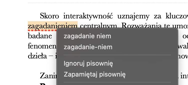 Here are the examples of many others. Here the word is "zagadanieniem", it shoudl be "zagadnieniem" and it suggests breaking it into two, out of which only "zagadnienie" is a real word. There is no "niem" in Polish...and certainly there is no "zagadnienie-niem" :) How does Pages even create such words?