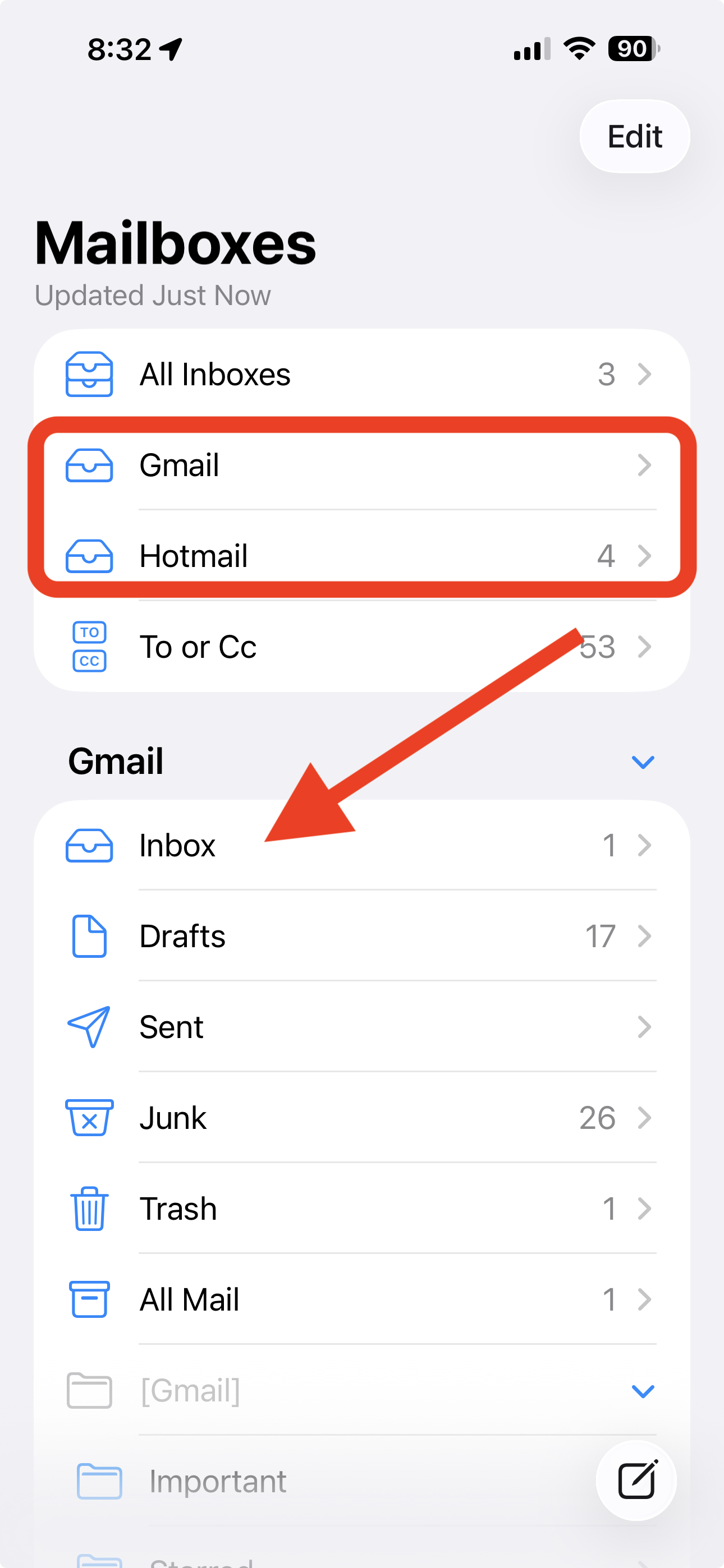 When you only have one account added (iCloud), you only see the one Inbox at the very top.