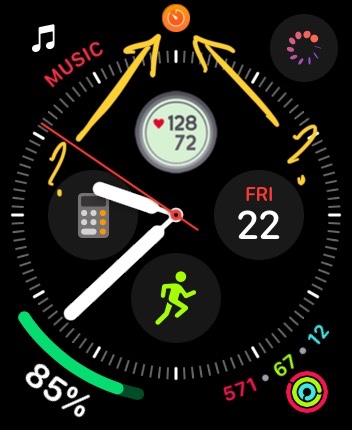 My Apple Watch is showing an orange dot at the centre of the screen at the top. It's not the microphone icon or red unread message icon. it looks like it matches have clock hands inside the icon but no timers or alarms are running. Anyone happen to know what it is? It's recently appeared.