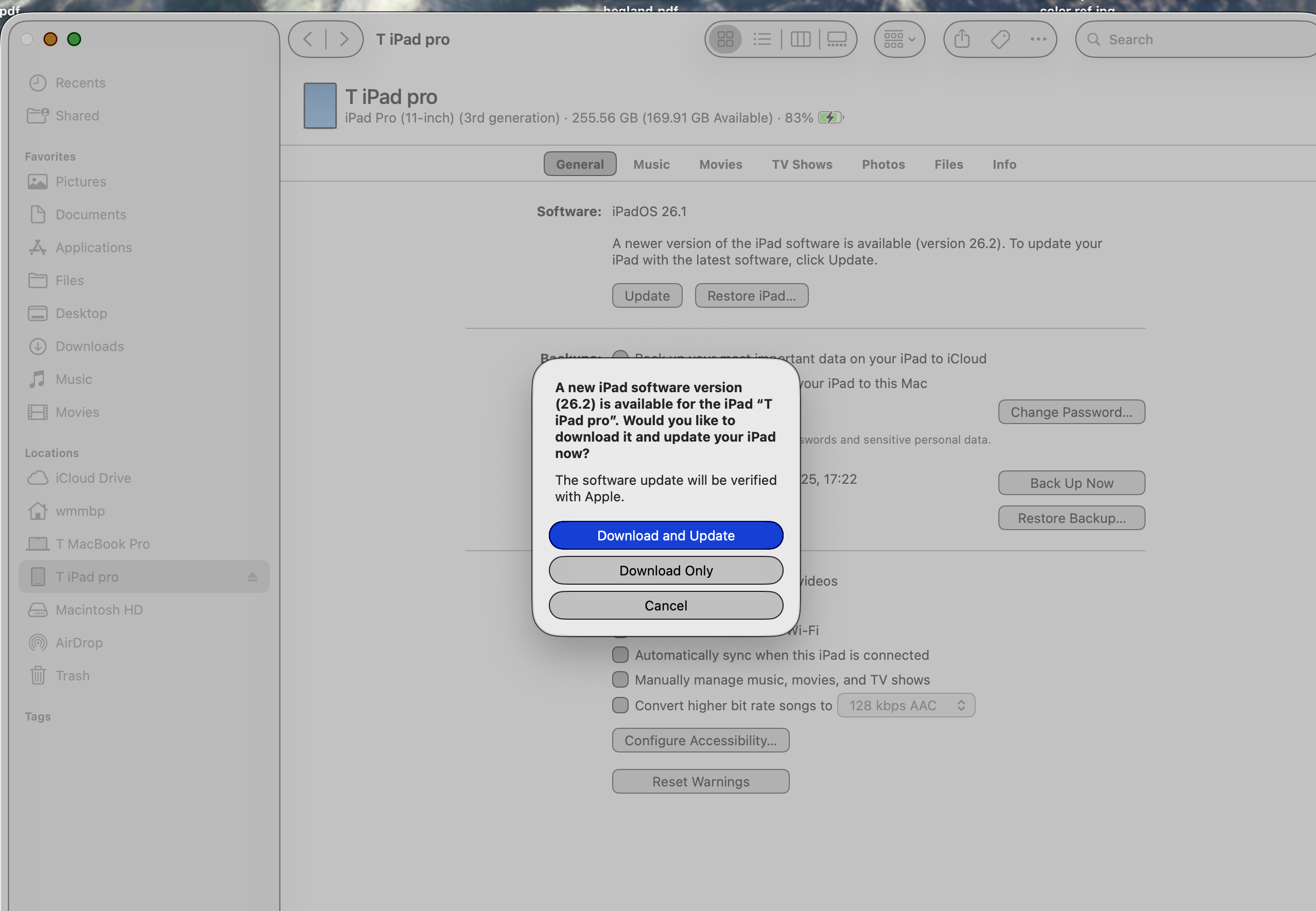 I updated iPhone wirelessly as iOS 26 was not being detected via cable in finder. MBP M3 Max, 2023 - now on Tahoe 26.1. My iPad Pro is last device still on 18.7.2, iPad Pro 3rd gen, 11 inch. Still not able to do that one for some reason with cable - iOS 26 not being detected. See here: IOS not being detected. I stated it when I discovered it was an iOS detection issue.